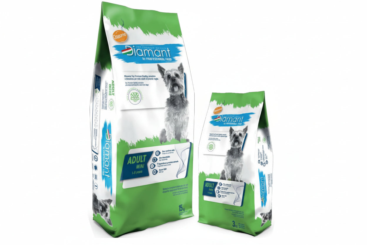 Diamant Mini Adult Dog Food is a complete and balanced dry food specially developed for adult dogs of small breeds. It supports easy digestion, high palatability, and daily energy needs using carefully selected ingredients.