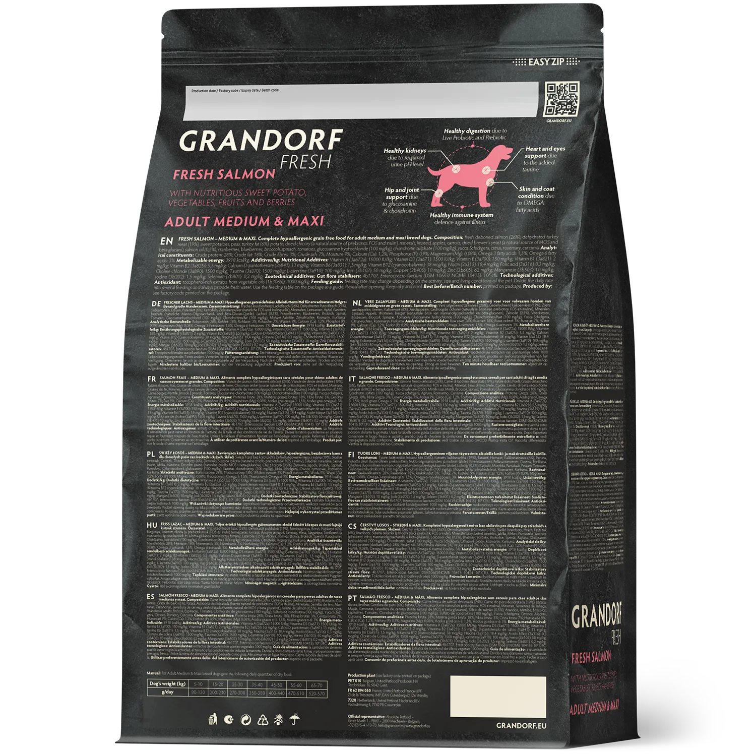 Fresh salmon fillet (26%), Dehydrated turkey meat (19%), Sweet Potato, Peas, Turkey fat (6%), Potato, Chicory roots powder (natural source of prebiotics: FOS and inulin), Minerals, Linseed, Apples, Carrots, Brewer’s yeast (natural source of MOS and beta glucans), Salmon oil (0.5%), Cranberries, Blueberries, Broccoli, Spinach, Tomatoes, Glucosamine hydrochloride (100 mg/kg), Chondroitin sulphate (100 mg/kg), Yucca Schidigera, Grapefruit, Rosemary, Curcuma.