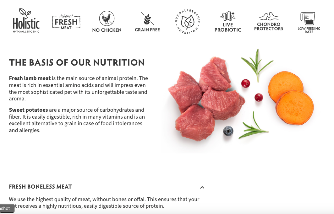 Fresh deboned lamb meat (26%), Dehydrated turkey meat (24%), Sweet Potato, Peas, Potato, Chicory roots powder (natural source of prebiotics: FOS and inulin), Linseed, Turkey fat (1%), Minerals, Brewer’s yeast (a natural source of MOS and bèta glucans), Salmon oil (1%), Apples, Carrots, Cranberries, Blueberries, Broccoli, Spinach, Tomatoes, Glucosamine hydrochloride (100 mg/kg), Chondroitin sulphate (100 mg/kg), Yucca Schidigera, Grapefruit, Rosemary, Curcuma.