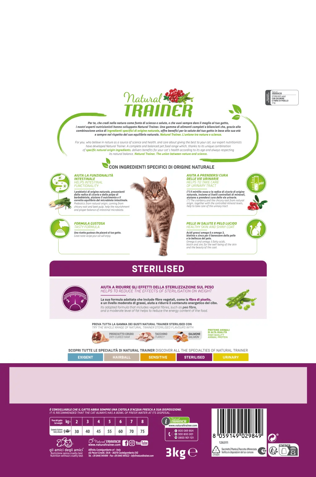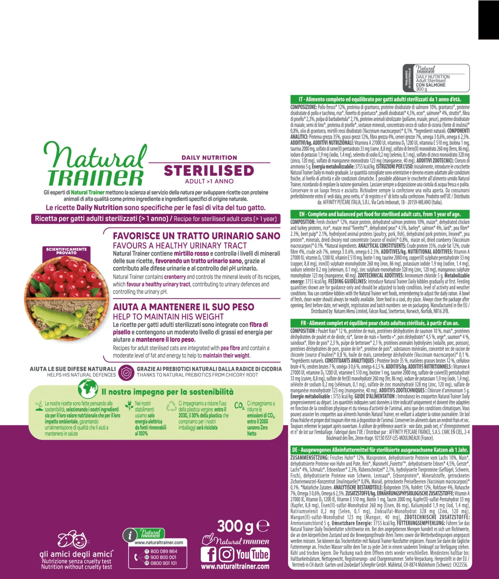 Daily Nutrition Sterilised Adult with Salmon is a complete and balanced dry food specially developed for sterilised adult cats from 1 year of age. Created by Natural Trainer experts, the recipe combines scientific research with ingredients of natural origin and high-quality animal proteins as the first ingredient.