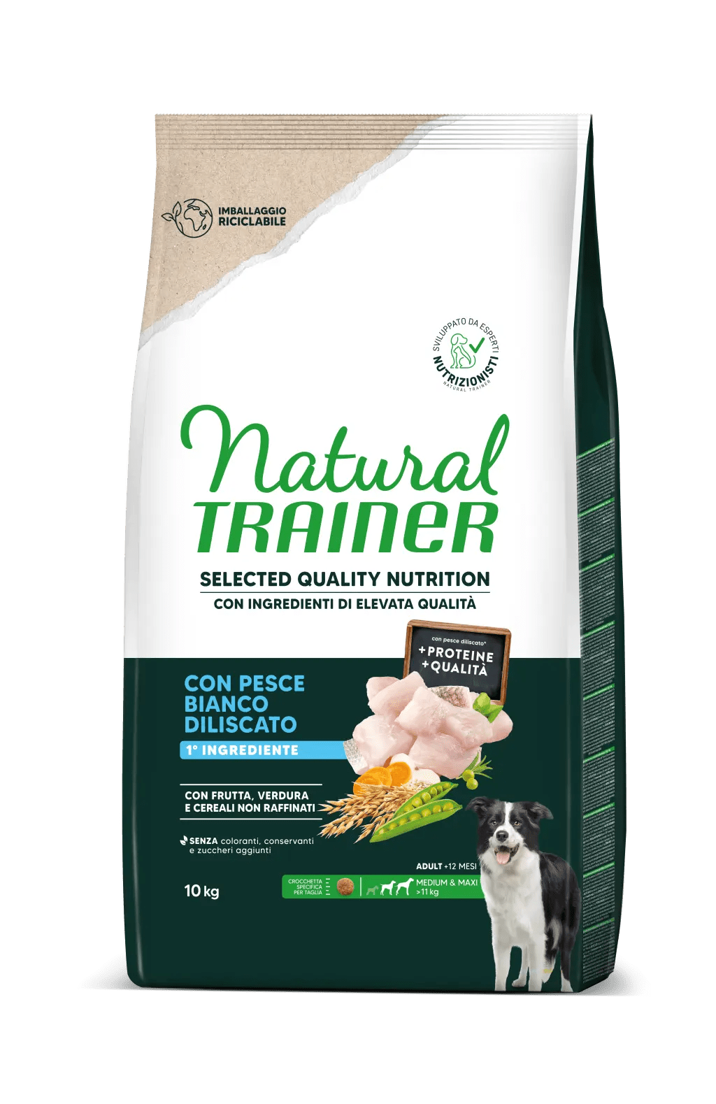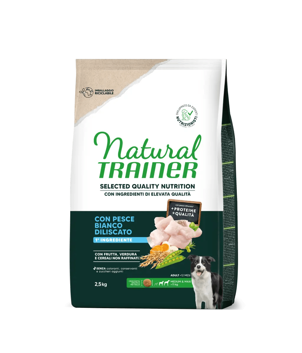 Complete and balanced dry food for medium and maxi adult dogs (>11 kg, +1 year) with high-quality deboned white fish. Supports optimal physical condition, healthy skin, shiny coat, and natural defenses.