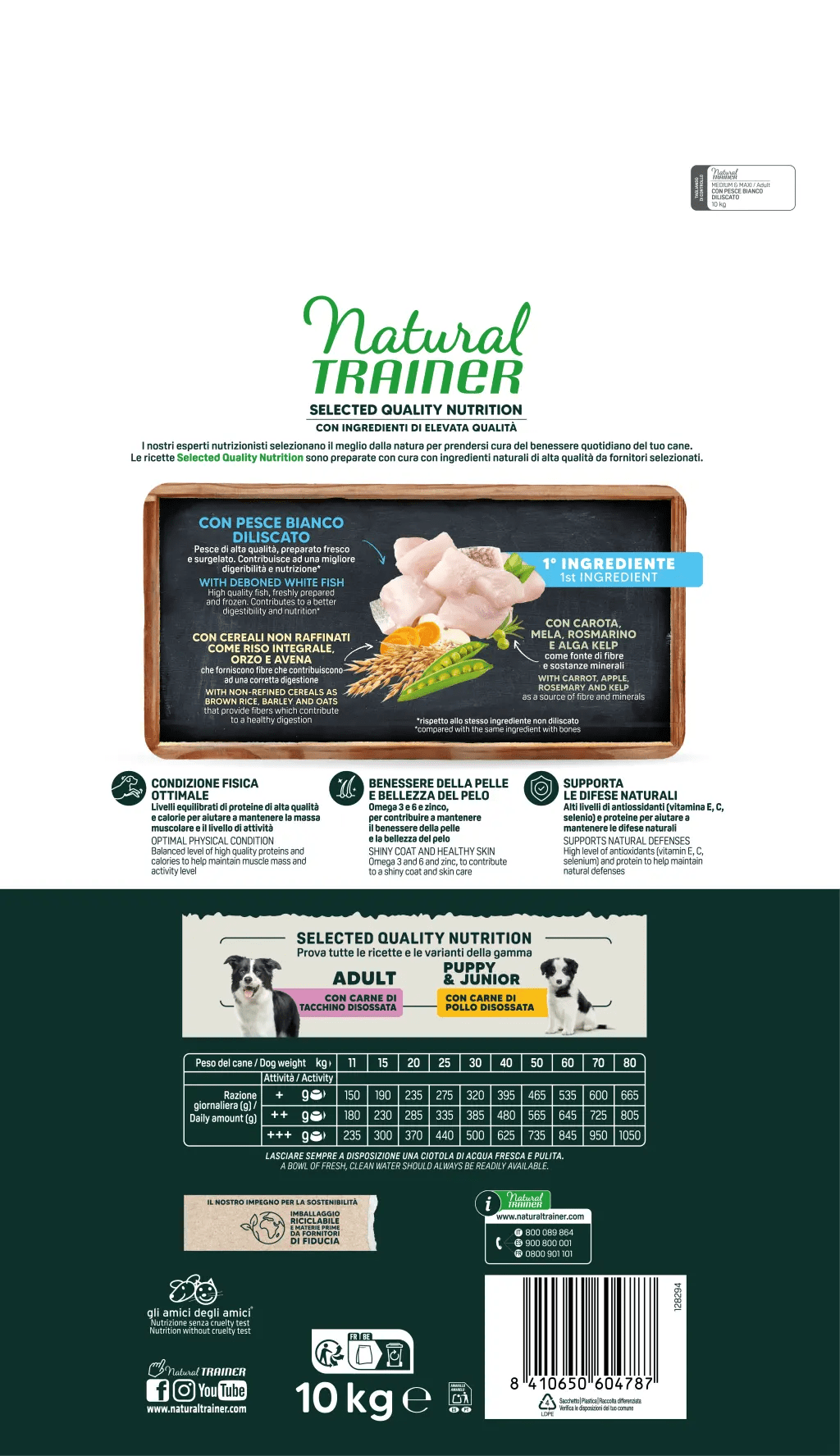 Selected Quality Nutrition Adult Medium/Maxi with Deboned White Fish is formulated with deboned white fish as the main ingredient, enriched with whole cereals (brown rice, barley, oats) and vegetables for optimal digestion, muscle maintenance, and overall vitality. Free from colorants, preservatives, and added sugars.