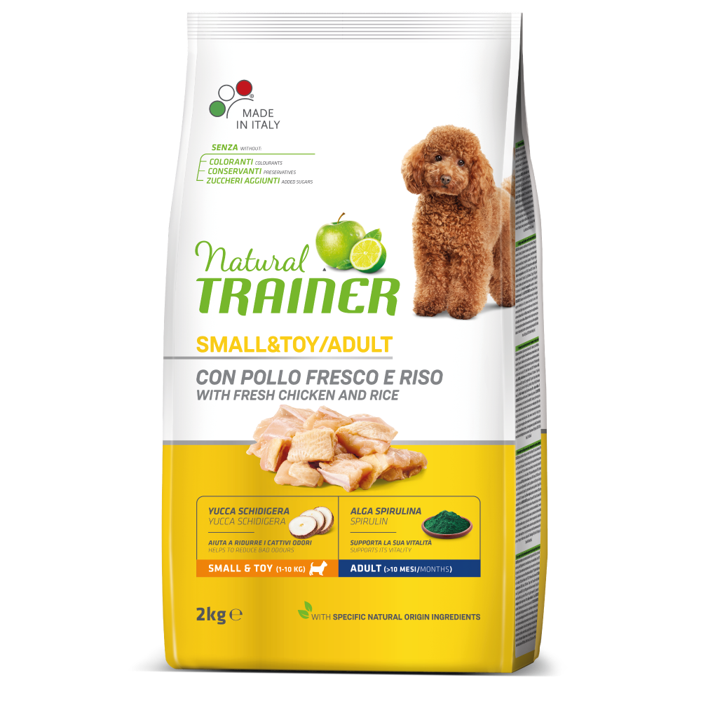 Complete and balanced dry food for small & toy-sized adult dogs (1–10 kg, +10 months). Fresh chicken as first animal protein, supports intestinal wellbeing, vitality, and helps reduce tartar formation.