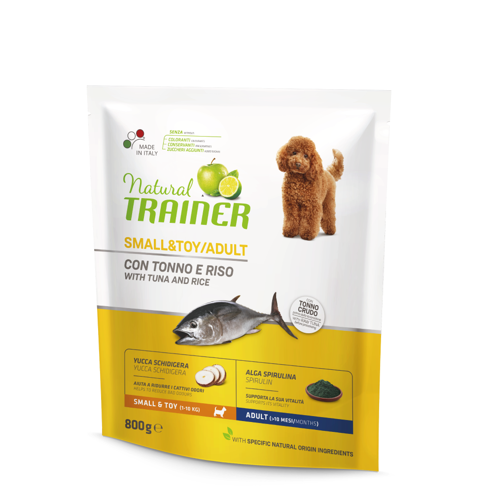 Complete and balanced dry food for small & toy-sized adult dogs (1–10 kg, +10 months). Single animal protein (tuna), supports intestinal wellbeing, vitality, and helps reduce tartar formation.