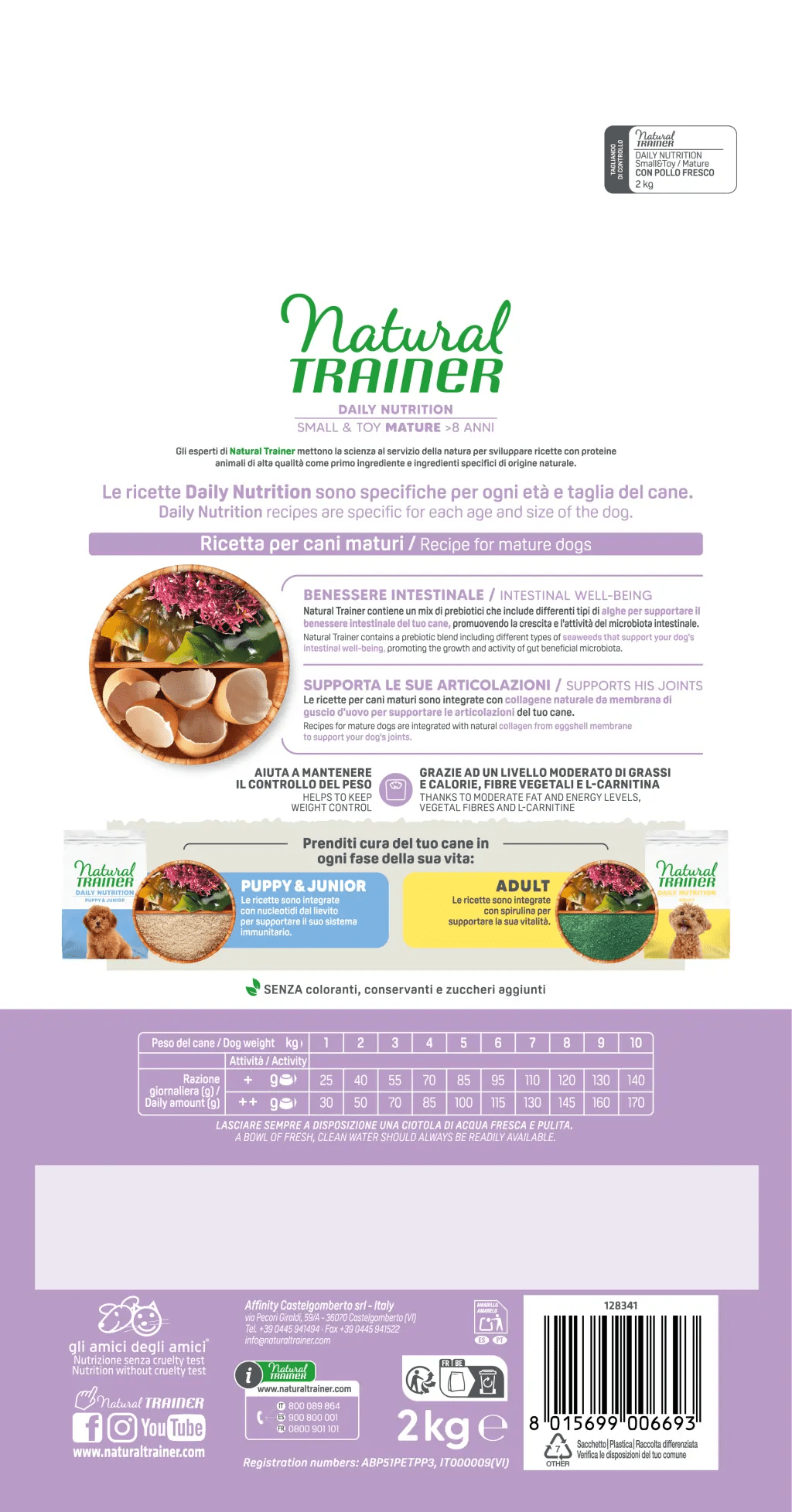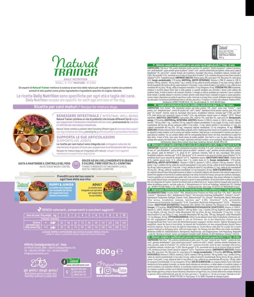 Complete and balanced dry food for small and toy mature dogs aged 8 years and above. Made with fresh chicken as the first ingredient, it supports intestinal wellbeing, joint health, and healthy weight control.