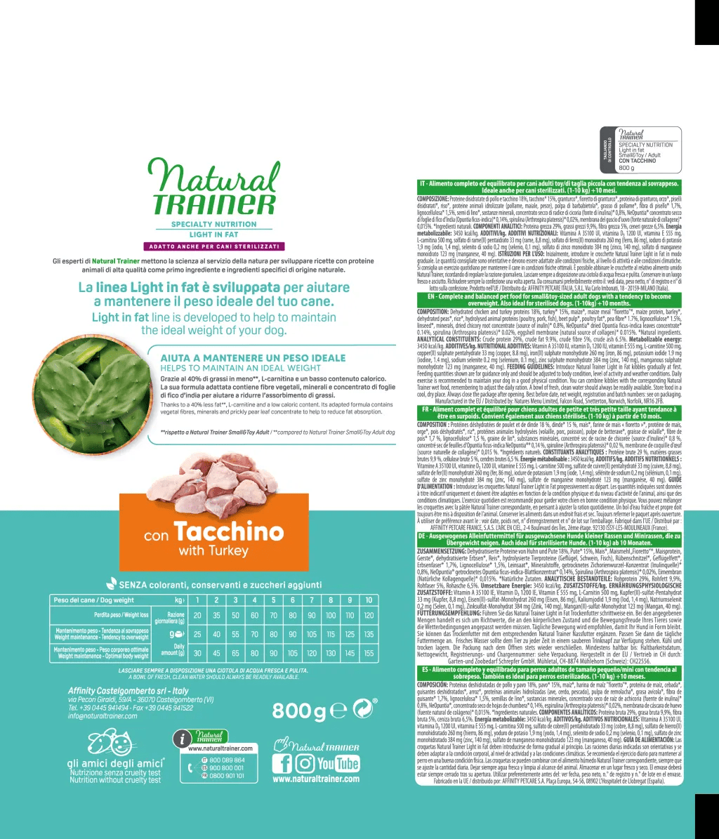Complete and balanced low-fat dry food for small and toy adult dogs with a tendency to become overweight. Also suitable for sterilised dogs. With turkey as the first animal protein and prickly pear leaf concentrate to help maintain ideal body weight.