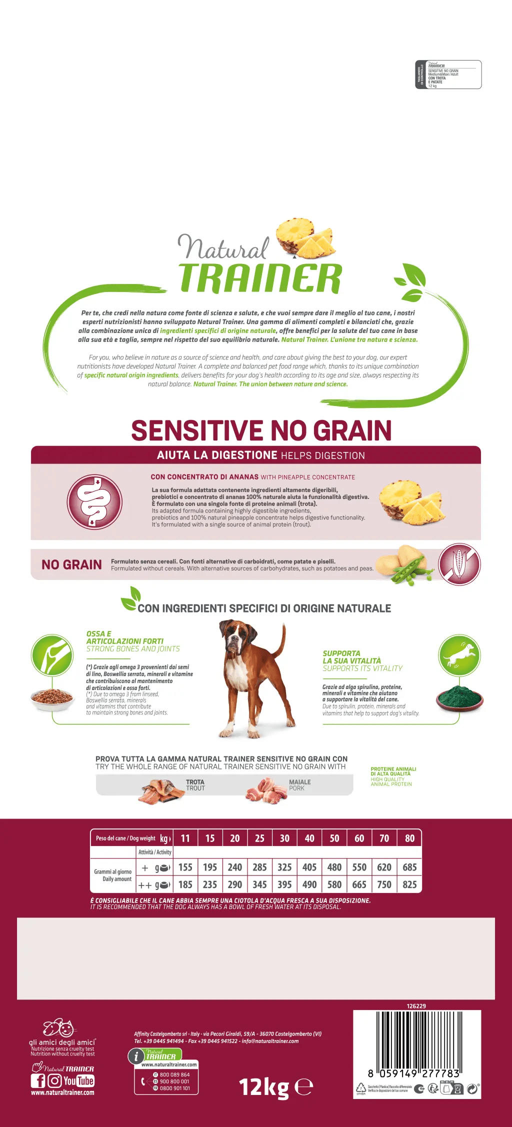 Complete and balanced dry food for medium and maxi-sized adult dogs. Grain-free, single animal protein (trout) formula with highly digestible ingredients, prebiotics, linseed, spirulina, and pineapple concentrate to support digestion, vitality, and joint health.
