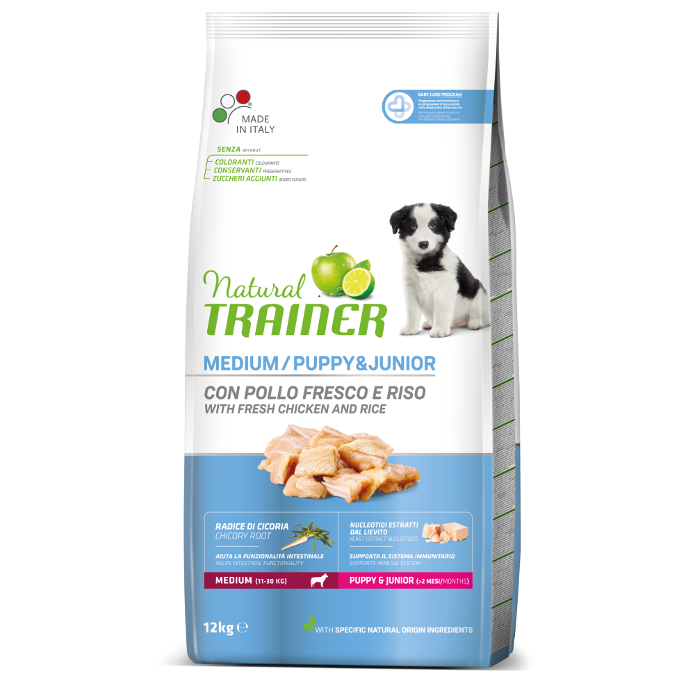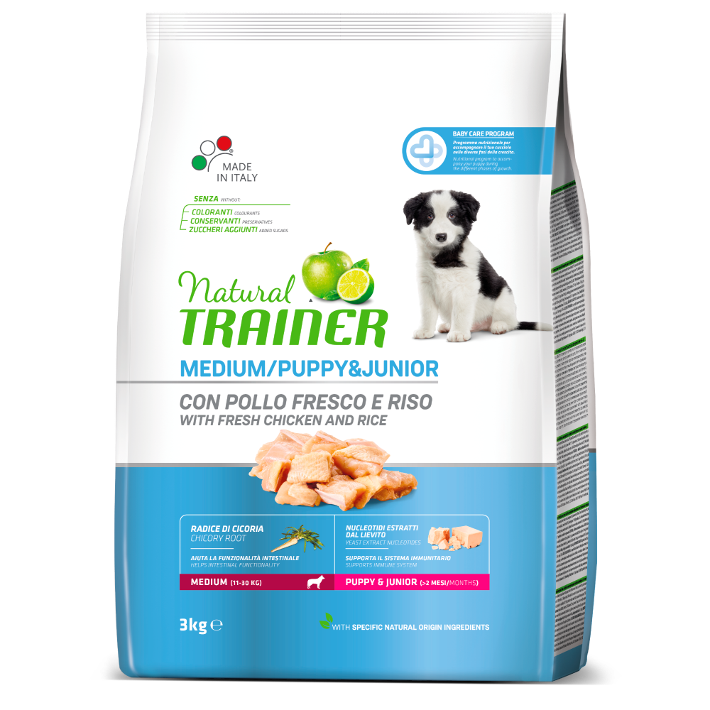 Complete and balanced pet food specially formulated for medium-sized puppies and junior dogs, providing optimal nutrition to support healthy growth, digestion, and immune system development.