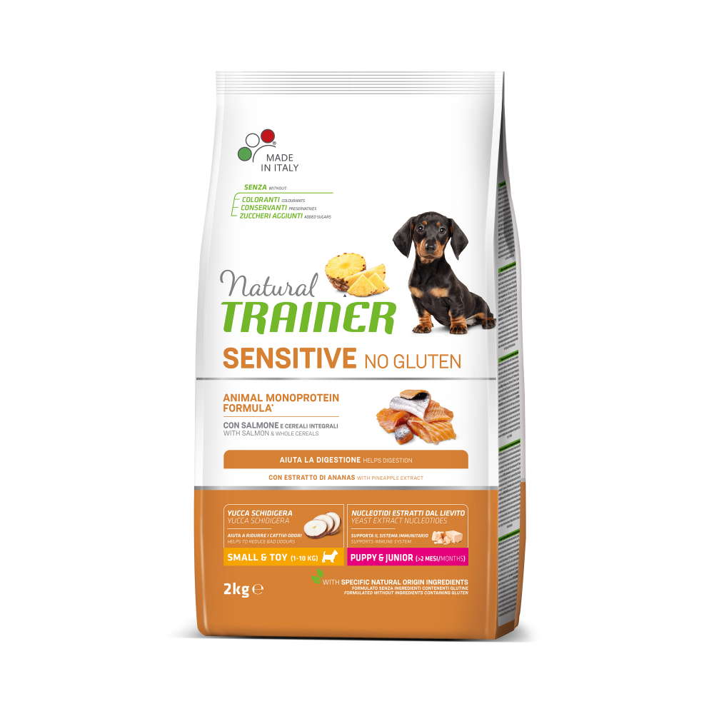 Specialty Nutrition Sensitive Monoprotein Small & Toy Puppy & Junior Salmon is a complete dry food for small & toy-sized puppies (from 2 months old, 1–10 kg). Its formula uses a single high-quality animal protein (salmon) and includes whole cereals with natural prebiotics from chicory root to support digestion.