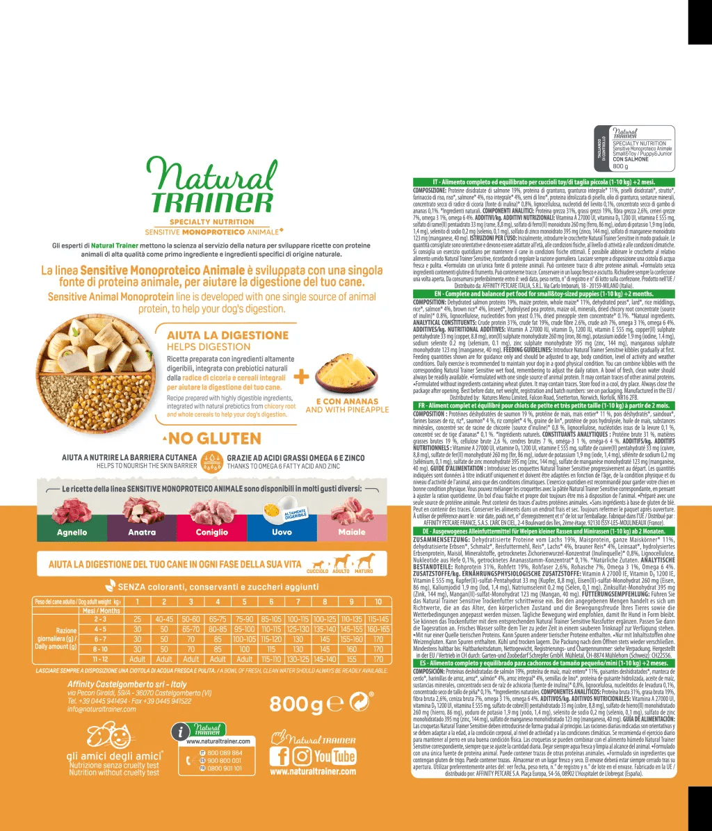 Complete and balanced dry food for small & toy-sized puppies (1–10 kg, from 2 months old). Single animal protein (salmon) with whole cereals and pineapple to support digestion, skin barrier, and healthy growth.