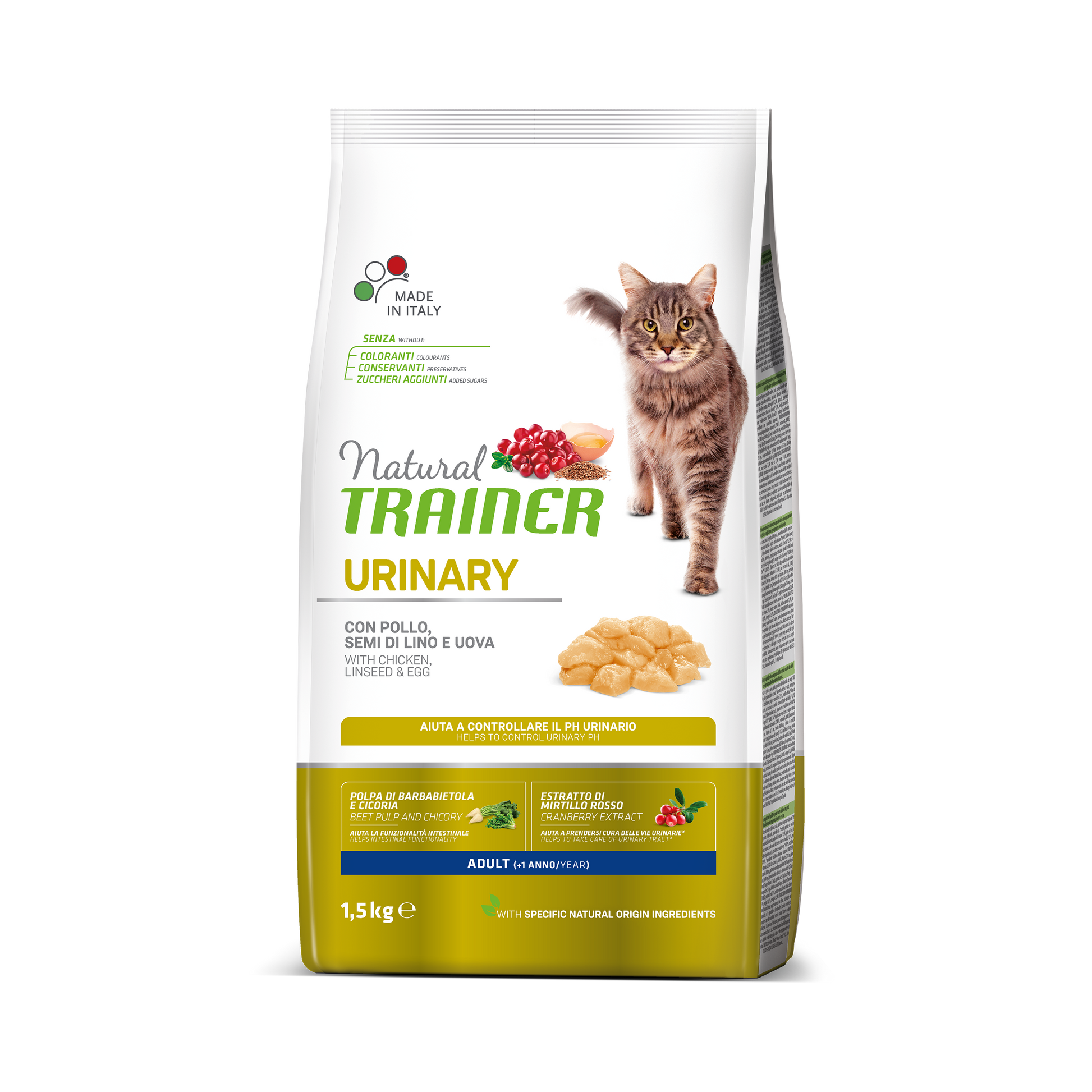 Fresh chicken provides highly digestible protein to support muscle maintenance and daily vitality. The adapted mineral balance, together with ingredients naturally rich in methionine such as linseed and egg, helps control urinary pH and reduce the risk of urinary discomfort. Cranberry and chicory root of natural origin contribute to urinary tract care, while beet pulp and chicory root prebiotics support healthy intestinal functionality.