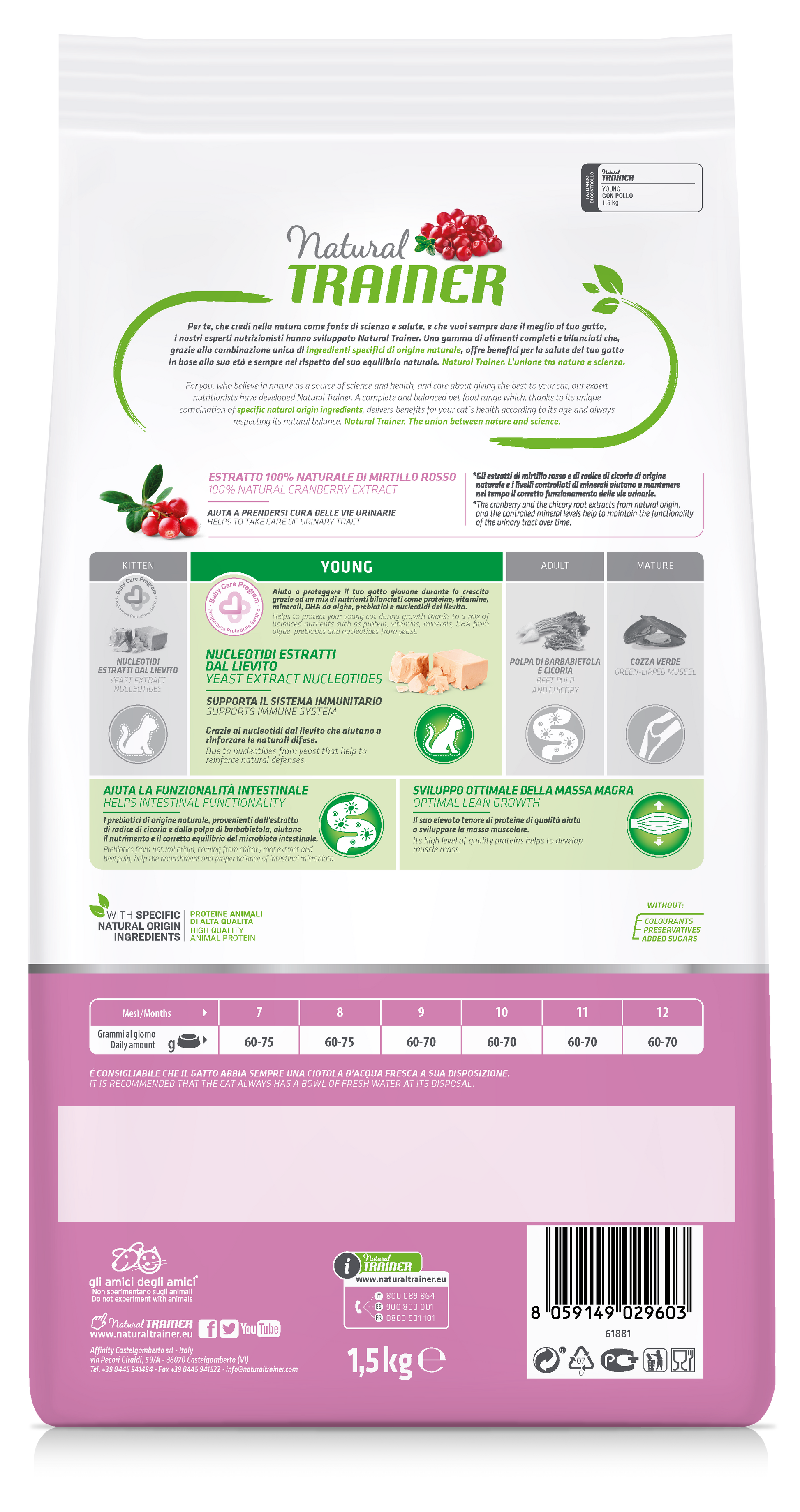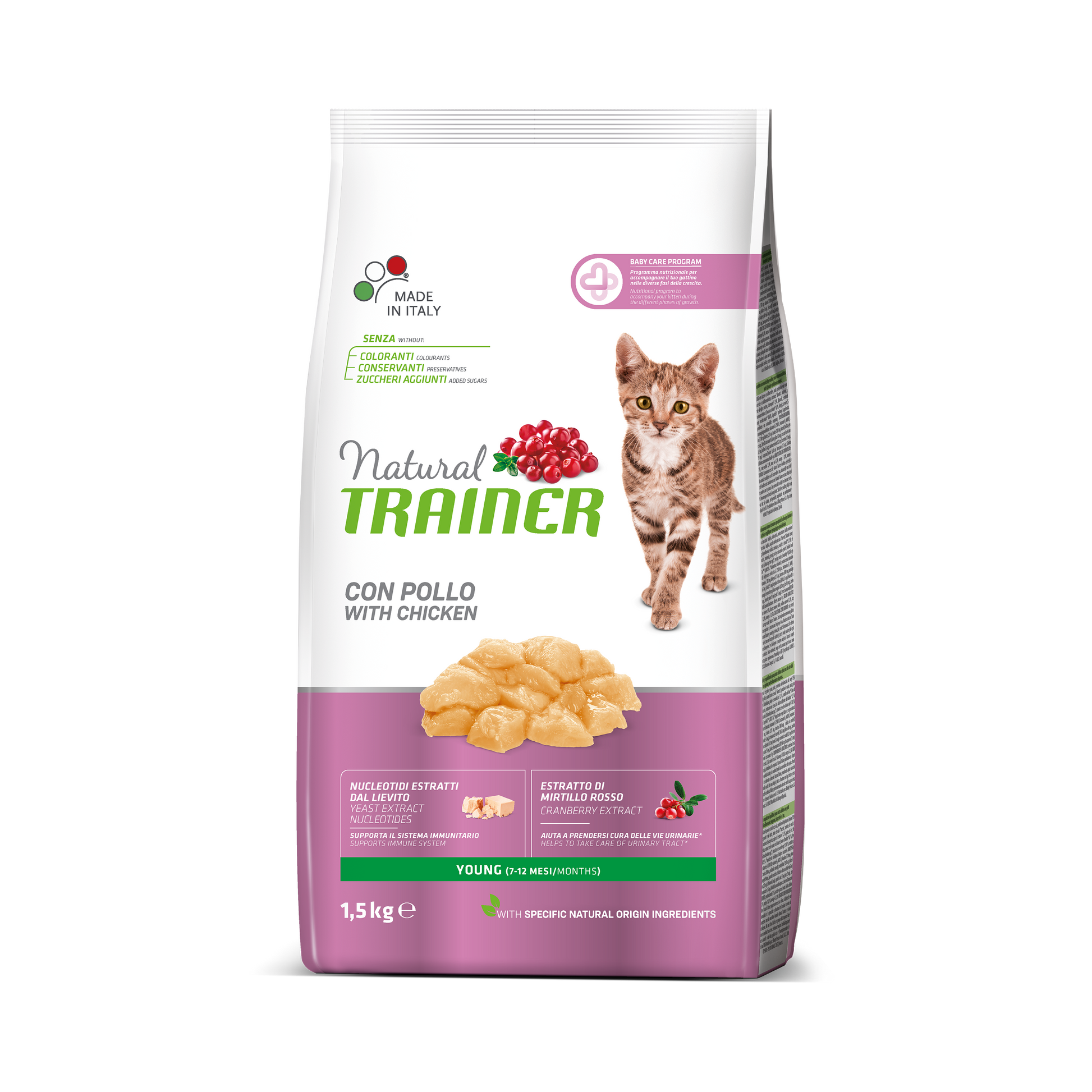 Daily Nutrition Young Sterilised With Fresh Chicken is specifically formulated to meet the nutritional needs of young sterilised cats from the time of sterilisation up to 12 months of age. Developed by Natural Trainer experts, this recipe supports healthy growth while addressing the specific needs of sterilised kittens.
