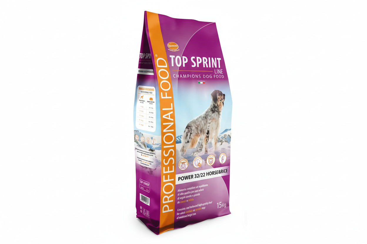 Top Sprint Power Horse & Rice is a complete food formulated for adult dogs with extremely high activity levels and for pregnant bitches, providing high concentrations of protein and fat to support endurance and muscle recovery.