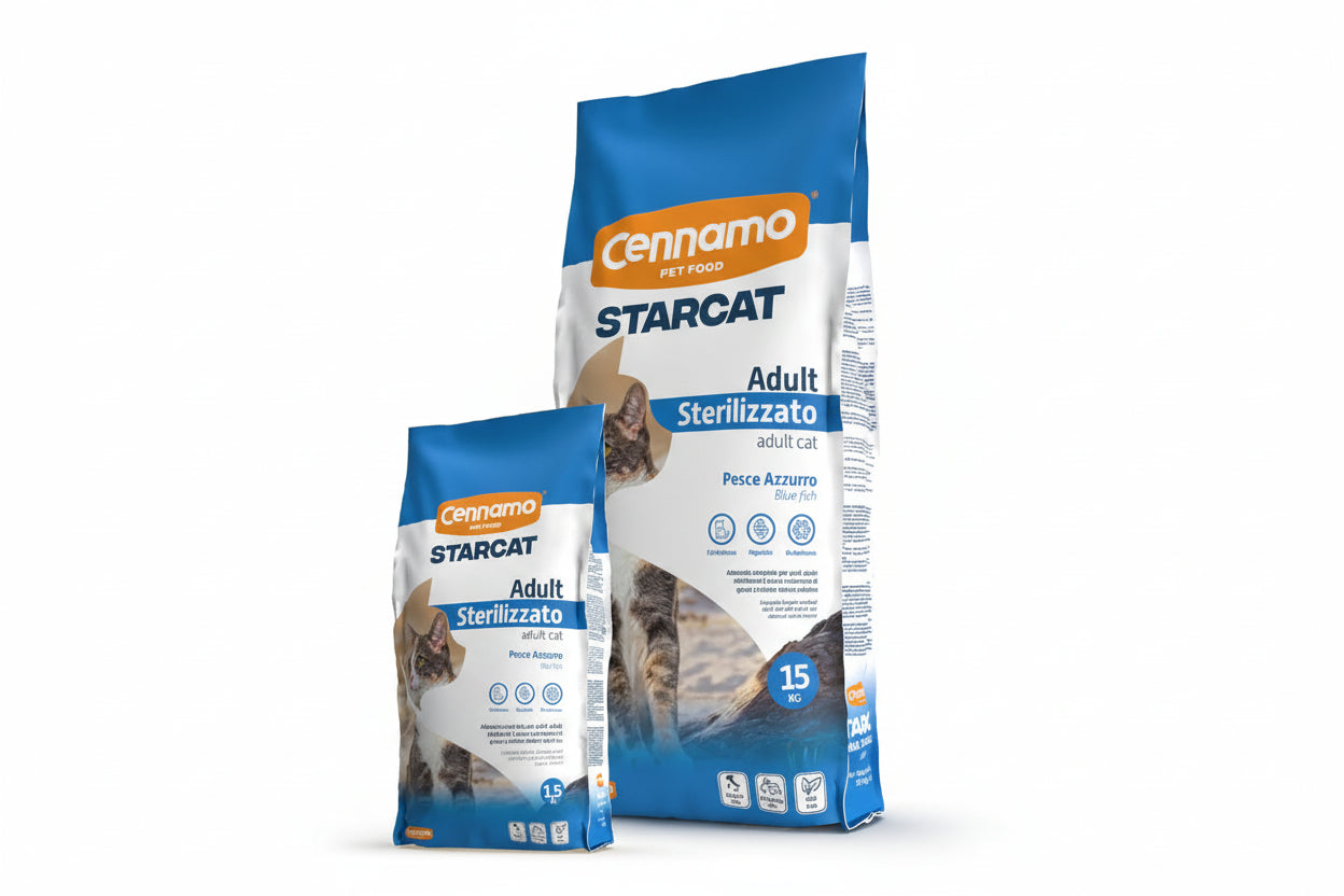 Starcat Adult Sterilized Blue Fish is a complete and balanced dry food specially formulated for sterilized adult cats. Its reduced fat and calorie content helps control body weight while supporting digestion, palatability, and overall health.