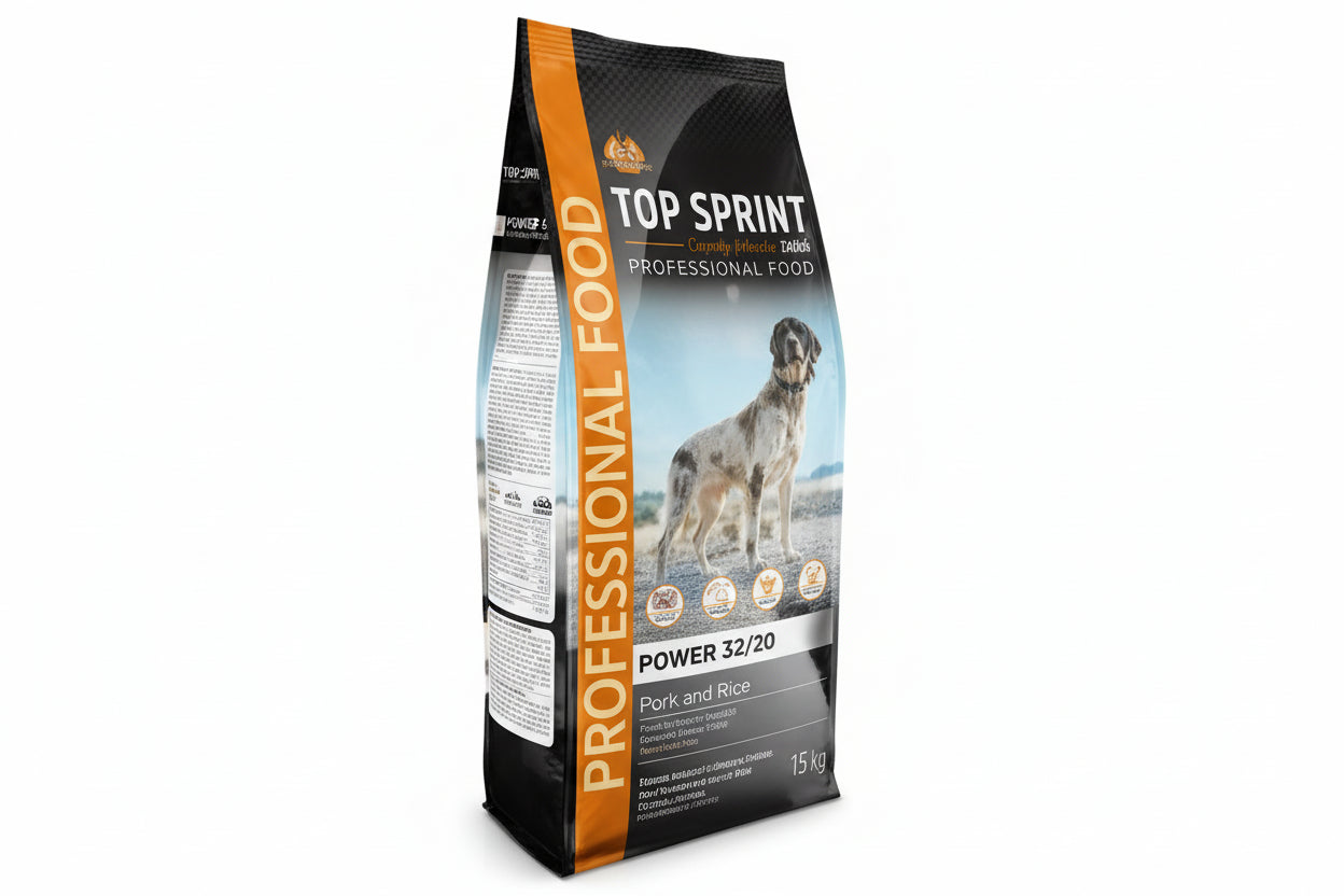 Top Sprint Power Pork & Rice is a complete food formulated for dogs with extremely high physical activity levels, pregnant or lactating female dogs, and dogs requiring high concentrations of protein and fat to support endurance and reduce muscle fatigue.